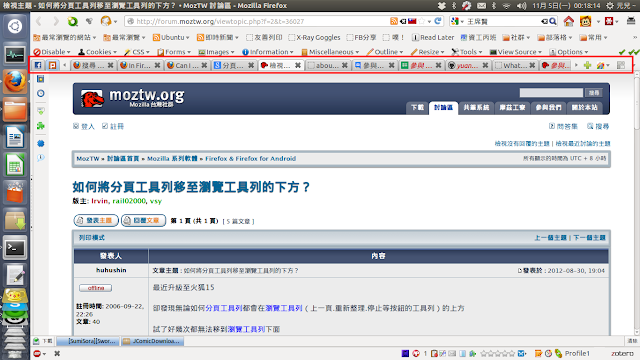 自從Firefox第4版開始,分頁列就預設移到網址列上方,我也就慢慢的習慣這種介面了。但可能還是有人不習慣這樣的介面。